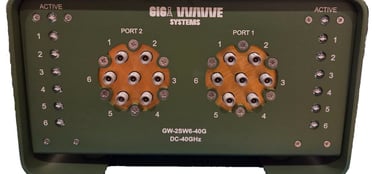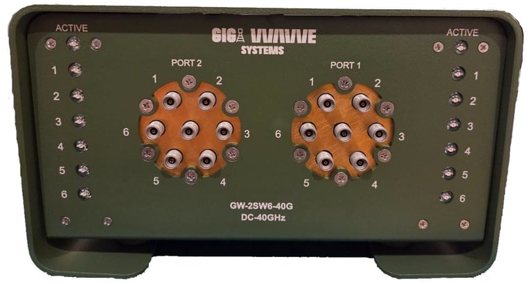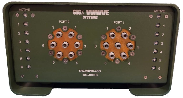 The Gigawave GW-2SW6-40G features two independently controlled electro-mechanical single-pole Six-throw (SP6T) switches, operating from DC to 40 GHz with high isolation and low insertion loss. These absorptive switches are designed with a failsafe, break-before-make conguration and o er a typical lifes pan of 2 million switching cycles when operated within the speci ed conditions. Housed in a compact and robust metal enclosure, the switch box is equipped with 2.92 mm (f) connectors and front-panel LED indicators for convenient test bench operation. Control is facilitated via USB (communi cations device class CDC, virtual com port) or Ethernet, enabling direct operation from a PC or remote access over a network. Comprehensive software support is provided, including programming instructions compatible with both Windows and Linux environments.