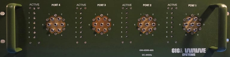 Gigawave offers four independently controlled electro-mechanical SP6T switches, operating from DC to 40 GHz with high isolation and minimal insertion loss. The absorptive switches are normally open and have a lifespan of 2 million switching cycles. Housed in a slim 19” rack chassis, the circular electromechanical switches feature 2.92 mm female RF connectors. Each active path is indicated by an LED on the front panel for clear visual status display. The switches can be controlled via USB or Ethernet, supporting SSH, HTTP, and Telnet network protocols. Additionally, a user-friendly GUI application is available for Windows, along with programming instructions for Linux.