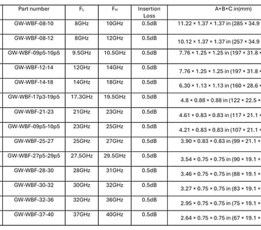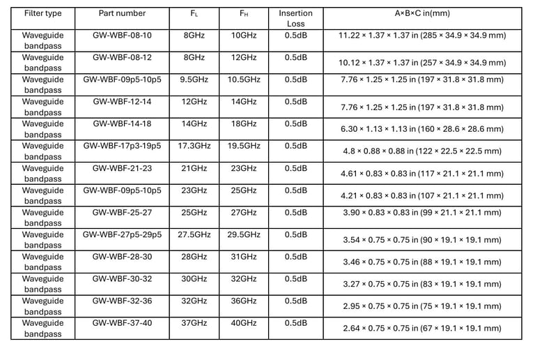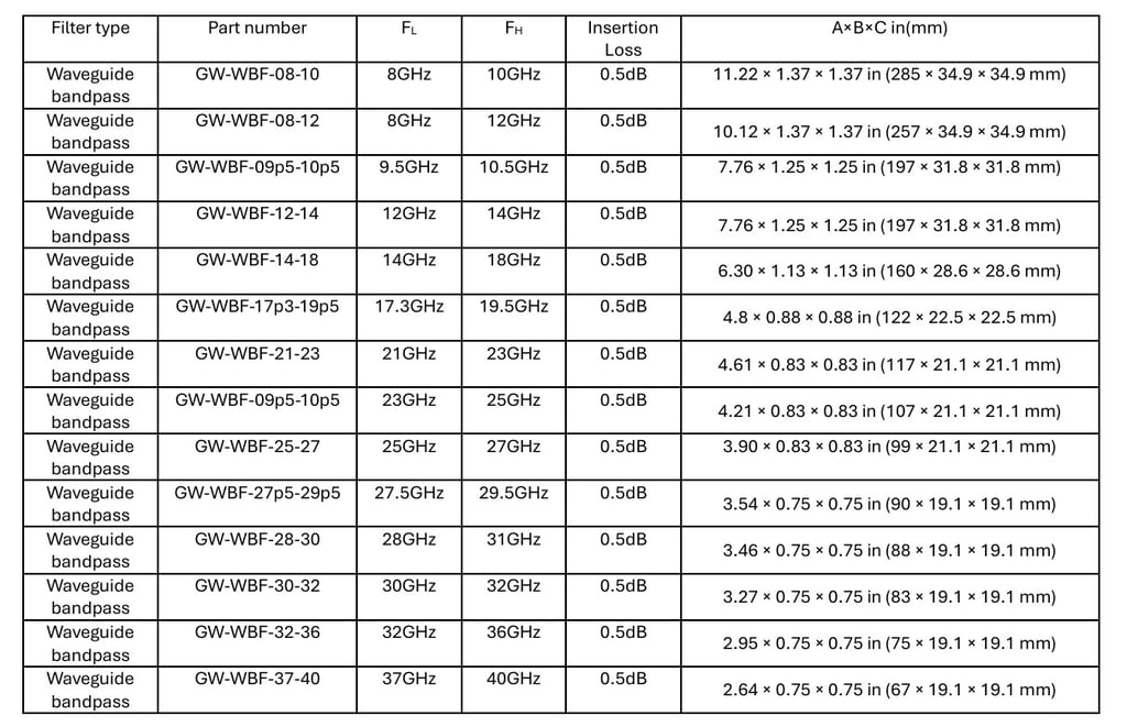 The GW-WBF-XX-YY series consists of waveguide bandpass filters covering the 8 to 40 GHz frequency range. These filters are available in various waveguide types and feature a maximum input VSWR of 1.2:1. Each unit is rated for up to 100 W of CW RF power and provides a maximum insertion loss of 0.5 dB with minimum rejection of 50 dB in the stopband.